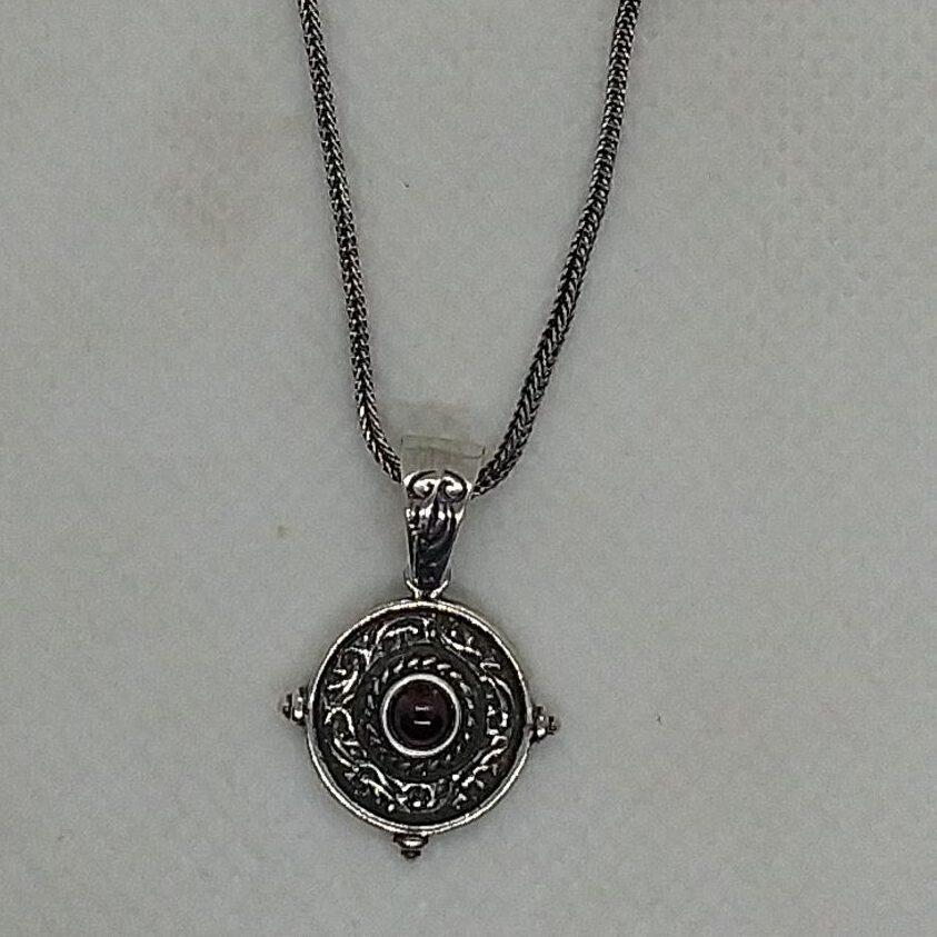 Χειροποίητο ασημένιο κολιέ παραδοσιακής γιαννιώτικης τέχνης. Οξειδωμένο με την παραδοσιακή τέχνη της οξείδωσης για να παραμένει αναλλοίωτο στον χρόνο, διακοσμημένο με σχέδια βυζαντινού τύπου και φιλοτεχνημένο με ρουμπινογρανάδα .Το μέγεθος της αλυσίδας είναι στα 40 cm,45 cm, 50 cm ανάλογα με την προτίμηση σας.